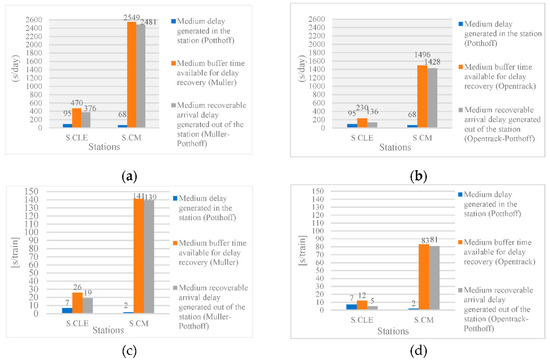 Delays, buffer times, and delay recovery potentials for Trieste Centrale and Trieste Campo Marzio stations by analytical and simulation methods listed as: (a) Result of Müller-Potthoff methods in seconds per day; (b) Result of Opentrack-Potthoff methods in seconds per day; (c) Result of Müller-Potthoff methods in seconds per train; (d) Result of Opentrack-Potthoff methods in seconds per train.