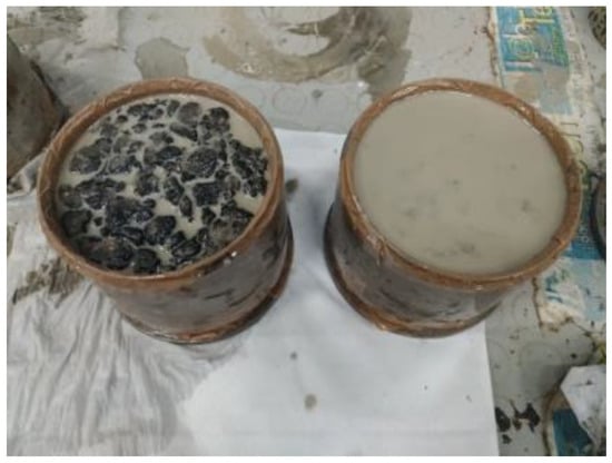 Once the mechanical properties of the grouting mixtures were defined, the asphalt samples were kept inside Marshall molds, where the bottom section was sealed to prevent any possible leaking of the grouting material. The prepared grouts were stirred thoroughly before use to ensure a homogenized mixture. The material was then poured on top of the porous asphalt specimens. This phase continued until the surface of the samples was covered with the grouting material (Figure 2). The samples were then cured at room temperatures for 24 h, demolded and cured for another 28 days. GM-C refers to the control grouted samples, whereas GM-SC designates samples containing silt-based geopolymer grouts.