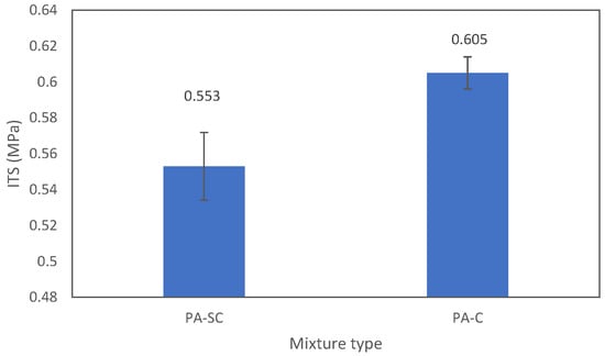 The effect of different asphalt fillers on the mechanical properties of porous asphalt samples was investigated through indirect tensile strength (ITS) (EN 12697-23). Three specimens were cured at 25 °C for 4 h before testing. The ITS results are summarized in Figure 3.