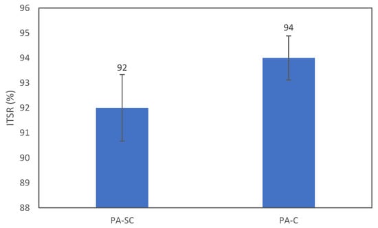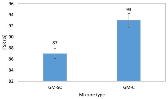 The ITSR of grouted samples is shown in Figure 7. The control sample presented an ITSR of 93%, while the ITSR of the geopolymer-grouted samples dropped by 13%. However, no significant difference was observed in terms of ITSR between the two groups (p = 0.061).