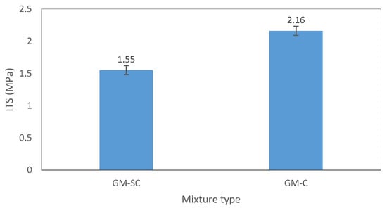 The ITS data of the grouted samples are shown in Figure 6. Three grouted samples for each grout type were tested. The highest ITS value of 2.16 MPa was obtained for the control samples, whereas an ITS of 1.55 was measured for the geopolymer cement-grouted macadam specimens. The statistical analysis indicated a significant difference between the different types of grouted mixtures in terms of the ITS (p = 0.0184).