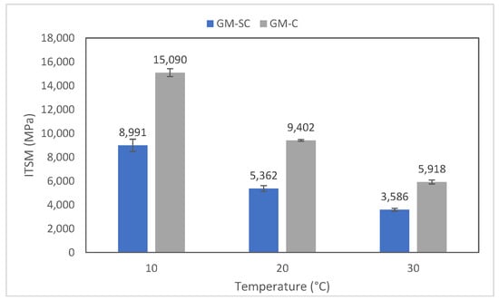 Figure 8 depicts the ITSM values obtained at three different testing temperatures of 10, 20 and 30 °C. The grouted samples showed an ITSM value of 8991 MPa at 10 °C, which decreased by 4.42% when compared to the control sample. The loss of stiffness was observed at each testing temperature. At 20 and 30 °C a decrease of 42.97 and 39.40% was reported, respectively.