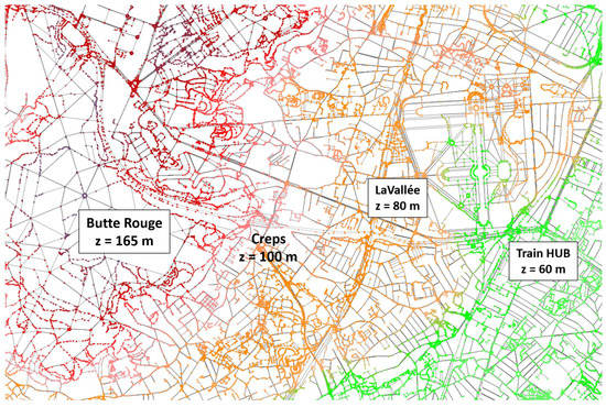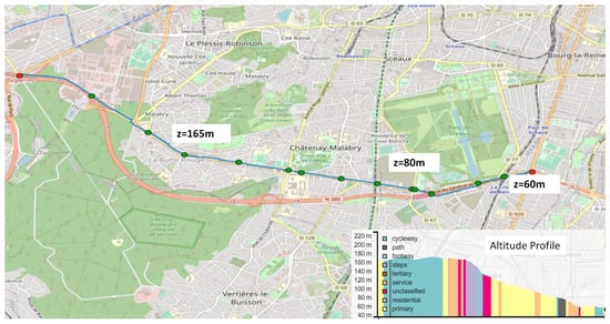 In this paper, we focus on the cyclist transportation model because the catchment area has a particularly challenging altitude profile and a large variety of roads, whether in type—from residential to national highway—or in pavement surface due to the number of green areas, as shown in Figure 2 and Figure 3.