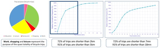 The focus of this case study is on bicycle trips. Cyclists represent 8% of the population. They represent 3% of the total trips. The distribution of trip purpose is as follows: 34% for work, 32% for leisure, 25% for shopping, 5% for restaurant and 4% for education, as shown in Figure 4. Most bicycle trips are within a radius of 5 km and a travel time under 20 min.
