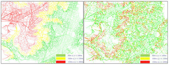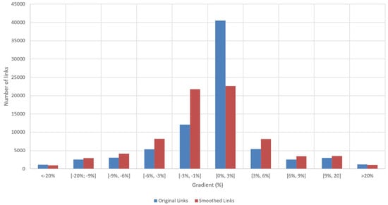 Another aspect to be considered when dealing with road gradient is the resolution of the elevation data of EU-DEM []: elevations are sampled every 25 m, but many links are smaller than that. If used as is, the extension model can lead to a large sampling error in calculating road slopes with some spikes in the gradient estimation. We showed, however, that the overall impact of the small resolution of the elevation data is minimal in terms of travel distance and travel time, at least in the study area.