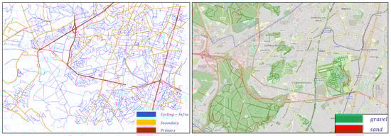 Type and pavement surface of bicycle infrastructure in the study area. The simulation uses a synthetic population of 9566 cyclists (8% of the whole population of 126,151 agents). (Left): primary highways (red) and secondary highways (orange) are prohibited (or to avoid) for cyclists, and the remaining routes are mainly residential (blue) cyclist friendly. (Right): gravel and sand routes are concentrated in the green spaces, and the remaining routes are considered asphalt.