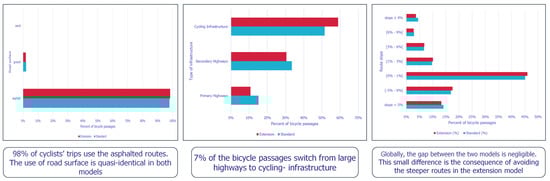 The results show that road characteristics’ impact depends on the trip type. For short trips, the selected routes are often residential and living-street highways, with no need to pass by large highways. A short trip means a short travel time and less variation in the geographical area, which reduces the impact of gradient and type of route. The large routes and cycleways propose a fast and continuous infrastructure for the cyclist in the standard scenario for long trips. These highways are penalized by an important reduction of travel speed in the extended algorithm, which impacts the cyclist’s route choice and forces them to switch to cycleways and residential routes: this switch increases the use of cycling infrastructure compared to the standard algorithm.