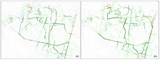 The concurrent simulations show that the use of the road surface is quasi-identical to both standard and extended score functions as shown in Figure 7: 98% of cyclists’ trips are on asphalted routes. The traffic flow is well distributed between the large highways and the cycling-friendly infrastructure with the standard score, while it is reduced by 7% with the extended score. In the standard scenario, 15% of bicycle traffic flow passes by primary highways, and 33% passes by secondary highways, while 52% passes by a cycling-friendly infrastructure; in the extension scenario, it is noticed that the traffic is reduced by 4% on primary highways and by 3% in the secondary highways, while it is increased by 7% in the cycling-friendly roads, compared to the first scenario.