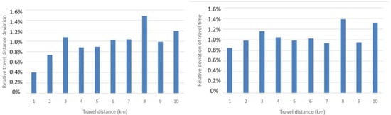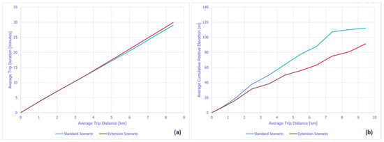 Figure 9a illustrates the variation of the average trip distance by trip duration. It shows that the travel time and distance are almost equal for the short trips. For the intermediate trips, the differences are not significant. The travel distance is increased by 0.7% (30 m), while the travel time is increased by 2.5% (30 s). For the longest trips, the differences are more important. The extension scenario trips are longer by 6% (400 m) in travel distance and 8% (2 min) in travel time.