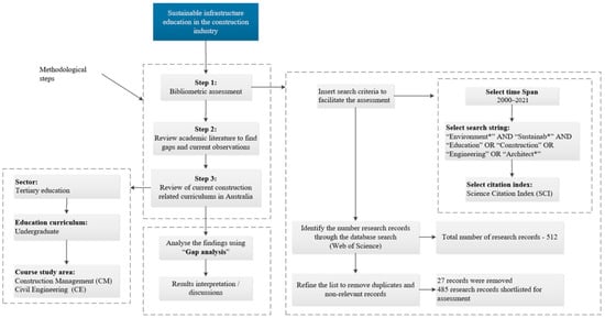 The main objective of this study was to review current findings and advances related to sustainability education in the infrastructure construction sector. Therefore, a three-step methodology, as shown in Figure 1, was developed to facilitate the gap analysis and to obtain relevant findings. Two review methods, including a bibliometric assessment and a review of the current construction management and civil engineering undergraduate curricula at Victoria University, Australia, were adopted to obtain a general understanding of current environmental sustainability levels in the HE sector. The initial (first) step involved reviewing current research practices and trends using a bibliometric assessment. Bibliometric assessment helps to categorise related data into relevant clusters and groups to facilitate the understanding of the current trends and developments of the selected theme. It is a popular statistical approach that can develop the interconnections and networks using indicators such as keywords, research topics, authors, and publishers of previously published articles to critically analyse current trends and knowledge gaps [12]. Scopus and the Web of Science (WoS) are the two prominent research databases that can comprehensively capture published literature in the field of construction and engineering. Therefore, the current study used the Scopus search engine to capture relevant previous studies due to its easy adaptability to many bibliometric assessment software packages [13,14,15]. As shown in Figure 1, the search criteria consisted of research publications including journal articles, conference publications, books, and book chapters from 2000 to 2021. The search string used terms such as “environment*” “sustainab*”, “education”, “construction”, “engineering”, and “architect*” using the relevant “AND” or “OR” operator. The asterisk (*) symbol was used to capture all similar keywords and studies on environmental sustainability education in the construction industry. The next (second) step of the methodology involved reviewing academic literature related to the gaps and observations highlighted from the initial step, i.e., bibliometric assessment. The review focused on three subtopics related to learning and teaching infrastructure sustainability including: (i) barriers to sustainable construction practices; (ii) environmental sustainability in built environment programs; and (iii) Continuous Professional Development (CPD).