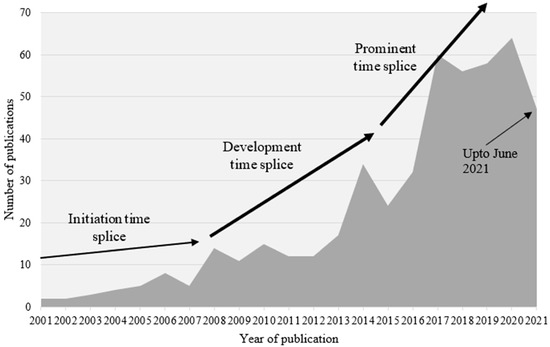 The timeline of the published articles in environmental sustainability in construction and related industries are highlighted in Figure 2. Based on the observations, the publication frequencies of articles can be discussed in three major time splices with a seven-year duration for each time splice. The initiation time splice from 2001–2007 had a constant rate of publications with less than ten publications per annum. The research interest initiation in the early 2000s can be linked to the adoption of the Kyoto Protocol (KP) on 11 December 1997 [16]. Since the adoption of the KP, research studies have focused on the introduction of education for environmental sustainability. The second time duration from 2007 to 2014 is presented as the development time splice due to an increased research focus on environmental sustainability in the construction industry. The initiation of the KP future targets and emission reduction strategies contributed to a gradual increase of research emphasis with an average annual publication of around 15 to 25 articles. The prominent time splice from 2014–present signifies the highest number and highest rate of publications with a sharp increase of publications in each year. This can be related to the first commitment period, from 2008–2012, of the KP emission reduction strategies (5% reduction as compared to the 1990 levels). With the recognition of impediments, focuses, and future directions, extensive research efforts were concentrated on environmental sustainability in construction. Moreover, the introduction of the UN SDGs in 2015 significantly influenced the research focus, and the number of publications almost doubled from 2016 to 2017. These results exemplify that research and education uptake are often connected with worldwide and nationwide initiatives and policy introduction.