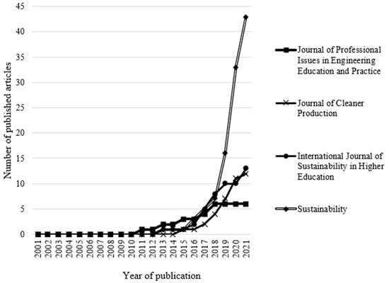 The top four journals with their article production numbers are illustrated in Figure 3. As highlighted, since 2016, the top five journal publications have significantly increased the publication rate of research on sustainability education in the infrastructure construction industry. The publication rate for the journals with a wider scope of publication, such as Sustainability and Journal of Cleaner Production, is considerably high as compared to journals with a specific focus. This may be due to the two journals having “sustainability” outlined in the aims and scope. Significant high publication numbers in the Sustainability journal may indicate the authors’ desire to publish in open-access journals with the intention of reaching a wider readership. The Journal of Professional Issues in Engineering Education and Practice was replaced by the Journal of Civil Engineering Education, and the current scope includes teaching methods, professional obligations, and the principles of formal education in civil engineering. These findings signify that the interest in implementing sustainability teaching strategies and techniques in construction and civil engineering education is significantly increasing.