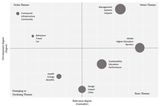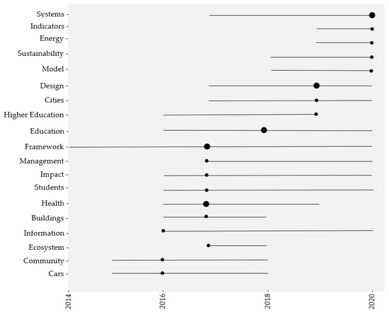 The key themes’ evolution and the keywords’ trending are highlighted in Figure 4 and Figure 5. The size of each circle in Figure 4. indicates the significance of each research topic considered in the analysis. The circles in Figure 5. at a given year reflect that the corresponding keyword was used more in that year, and the size of the circle reflects how frequently the keyword was used. The bigger the circle size, the more that keyword has been used in scientific publications. These findings could facilitate the understanding of current research trends and future focuses in the educational and research fields related to sustainability education. Figure 4 indicates that the development of sustainability frameworks to address infrastructure and community aspects is a recently developed specialized research discipline. However, the focus has diverted towards research areas such as travel behaviour and sustainable transportation modes, while education for sustainability has reduced its importance. Education and HE themes related to sustainability are at the basic level or travelling with less interest. Health- and energy-related topics in the infrastructure construction sector have also gained significant research interest over the past decade. The trending terms graph in Figure 5 reveals that “buildings” as an infrastructure type had more focus on environmental sustainability education, while other infrastructure types were seldom mentioned. However, the terms “cities” and “eco system” suggest there is a growing interest in sustainability education at the urban level as compared to the project level. Keyword terms such as “cars” and “health” further signify the considerable research attention towards sustainable behaviour and the use of infrastructure assets such as roads.
