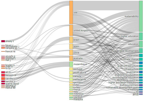 A “three plot” between authors vs. countries vs. keywords, as shown in Figure 6, was derived to gain an understanding of the level of sustainability education in different countries across the globe. The United States of America (USA) and the United Kingdom (U.K.) are the leading countries to implement sustainability and sustainable development in their engineering HE curriculum. In addition to these two countries, China and Australia have made significant efforts to integrate sustainability into the Higher Education (HE) curriculum. Despite showing a keen interest in sustainability, Australia has not focused significantly on green infrastructure construction and environmental sustainability in the HE engineering curriculum over the past few decades. The term green infrastructure often refers to a facility or an asset that is designed and constructed to improve the environmental performance and economic benefits and enhances social life. Specific knowledge of design and construction concepts is required to effectively construct a green infrastructure asset. The results also indicate that sustainability education is divided between “engineering education” and “environmental education”. This suggests that environmental sustainability concepts are either embedded in engineering curricula or stand alone as an environmental course. The annotations in Figure 6 further illustrate that education and knowledge development related to the policy and governance aspects of sustainable and green infrastructure have seen decent advancements. However, another main observation is that “e-learning” and technology-related sustainability education has had a weak development and needs future improvements and research focus to identify technology integration possibilities. Moreover, a combined interpretation between the authors, countries, and keywords indicates that several studies conducted in different countries such as Canada, India, France, and Italy have published only a handful of studies on green/sustainable infrastructure education and, thereby, have no links to top publishing authors.