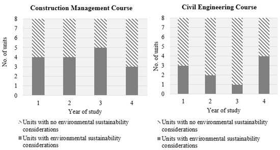 Figure 7 illustrates the distribution of sustainability- and non-sustainability-related units in both CM and CE courses across the four years of study. The distribution considered both horizontal and vertical integration of sustainability concepts in unit curricula. Sustainability topics and considerations in CM units spanned uniformly across all four years, while first and fourth year units in the CE course incorporated the majority of sustainability-related contents. This is mainly because the CE course incorporated fundamental sustainability concepts in the first year and design-specific environmental sustainability aspects in the fourth year. On the contrary, the CM course covered a wide spectrum of sustainability including fundamental concepts, technical criteria, policies and legislation requirements, and innovations related to construction. Similar to the CE course, the fourth year units in the CM course focused on specialised environmental sustainability competencies related to design and management in construction.