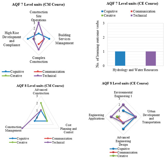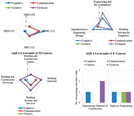 Figure 8 depicts the distribution of learning outcomes relating to sustainability and the corresponding learning areas for the CM and CE courses at Victoria University across AQF Levels 5–8. For each AQF level, the units containing sustainability-related learning outcomes are listed with the number of learning outcomes for each learning area highlighted. Each learning area is represented through the corresponding key verbs used in the learning outcomes of each unit, as per Table 4. The results indicate that units across all four years in both courses focus on improving cognitive skills related to environmental sustainability. In CM, the learning outcomes of AQF Level 8 units were more focused on the creative learning area, while AQF Level 5 was more focused on the cognitive and communication learning areas related to environmental sustainability. The technical learning areas in environmental sustainability were more embraced at AQF Levels 6 and 7. In contrast, the majority of the CE units focused, at all AQF levels, on improving cognitive and technical skills related to environmental sustainability. Thus, the CE students learn mainly the technical and fundamental environmental sustainability aspects as required to facilitate engineering designs and applications. These findings imply that both curricula cover cognitive skills related to environmental sustainability and a lack the application component. Thus, graduates and industry professionals require additional time and commitment to understand the practical implementation, including sustainable assessment and evaluation. There is a strong need for a structured and well-complimented program that could facilitate the sequential learning and required practical environmental sustainability in construction competencies’ development.