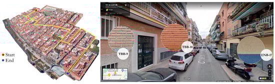 Figure 1 shows representative images of the tasks carried out in the first campaign to identify the finishing materials in the selected neighborhoods. In the left, a map is depicted of the route taken to go through the different urban morphologies and open urban spaces encountered within the Picazo neighborhood. In the right image, the information collected at a specific area of the neighborhood is shown. This includes geo-localization and a street view picture of the area and the detailed location and image of three different vertical finishing materials that are properly identified by the assigned reference.