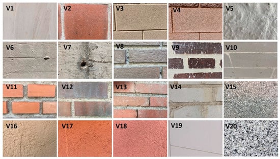 Twenty finishing materials were selected from the surfaces of vertical urban-facing elements (see Figure 3). V1 corresponds to calcareous stone cladding with a smooth surface, V2 to ceramic tiles with a semi-rough surface and common terracotta color, V3 and V4 to concrete blocks painted with two different light colors, V5 to white paint on rough plastering, and V6 and V7 to different continuous cement mortar wall coatings. One of the most common finishing materials in the facades found in the sample from Madrid was the facing brick. V8 to V14 are the cases selected from the wide range of colors and textures found in this type of building facade surface in the neighborhoods analyzed in this work. V15 is an exposed aggregate concrete cladding and V16 to V18 are representative of the wide variety of mortar claddings found in the facades, most of them in light or reddish colors. Finally, V19 is a pre-cast concrete white element and V20 is a granite slab.