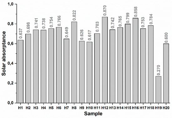 Regarding the asphalt finishes, the solar absorptance obtained for sample H16 (0.86) is in good agreement with the values between 0.8 and 0.9 reported in [] for in-use asphalt. The lower value of 0.75 obtained in the present work for the more-degraded asphalt represented by sample H17 is also coherent with the values reported for roads subject to long aging, in which the binder has almost disappeared and the surface is mainly composed of aggregates.