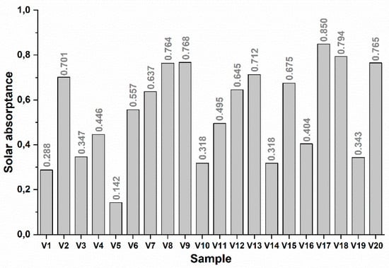 The solar and visible absorptance values were calculated from the mean spectrum of three measurements in each case. In addition, the three color coordinates defined in the CIELAB 1976 space, corresponding to the CIE 1964 Standard Observer and D65 Illuminant, were calculated for each sample from the mean reflectance spectrum in the visible range (380–780 nm). The L* coordinate indicated lightness, with values of 0 for black and 100 for white. The a* coordinate could have values of between −90 and +90, with negative values for green and positive values for red. Finally, the b* coordinate may also have had values of between −90 and +90, and negative was for blue, and positive was for yellow.