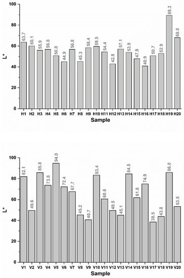 Color coordinate L* of the materials analyzed in situ. Top: horizontal surface finishes. Bottom: vertical surface finishes.