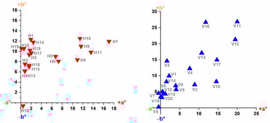 Color coordinates a* and b* of the materials analyzed in situ. Left: horizontal surface finishes. Right: vertical surface finishes.
