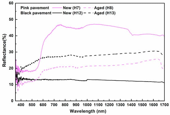As previously noted, an interesting result from the characterization of the surface urban materials refers to the aging effect on their optical response. Figure 7 shows the mean reflectance spectra of four of the measured pavements representing different aging stages. In the case of the pink pavement named as H7 in its brand-new stage, a clear decrease in the reflectance is observed upon aging (sample H8) in the whole solar wavelength range, which gives rise to the significant increase in solar absorptance from 0.65 to 0.82 (Figure 4). This variation will increase the heating of the pavement surface by solar radiation and is coherent with previous works on the effect of weathering, soiling, and abrasion on the solar response of cement-based materials []. Regarding the visible range (wavelengths from 380 to 780 nm), the decrease in reflectance with aging accounts for the decrease in the L* coordinate from 56.8 for H7 to 45.3 for H8. A change in the shape of the reflectance spectrum is also observed for wavelengths higher than 616 nm. This change gives rise to the variation of the b* and, especially, the a* coordinates that takes a significantly higher value in the new H7 sample related to the reflectance maximum at 750 nm, which is not present in the aged stage (H8). The results are coherent with the appearance of the surfaces shown in Figure 2.