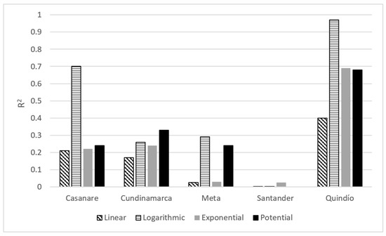 To continue the analysis of correlations, we proceeded to only work with travel conditions between municipalities and the capital of their respective department. Linear, exponential, potential, and logarithmic regressions were carried out between the MRW of each municipality and the average travel time to the capital city (recalling that this variable consists of times georeferenced by Google Maps on a workday and during peak hours). The R2 for the department of Quindio varied between 0.40 and 0.97, for Casanare between 0.21 and 0.70, for Cundinamarca between 0.17 and 0.33, for Meta between 0.026 and 0.29, and for Santander between 0.0004 and 0.025 (Figure 1).