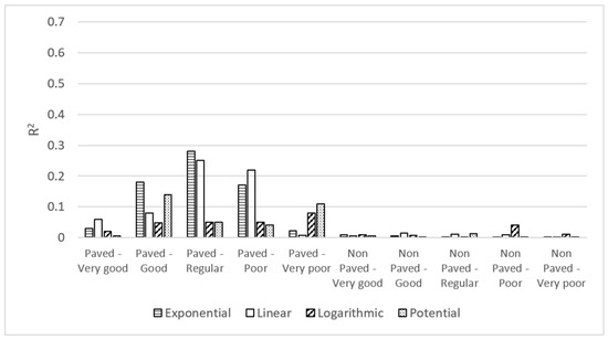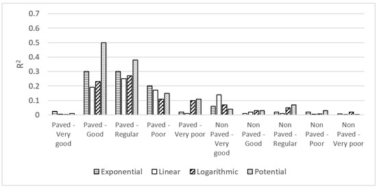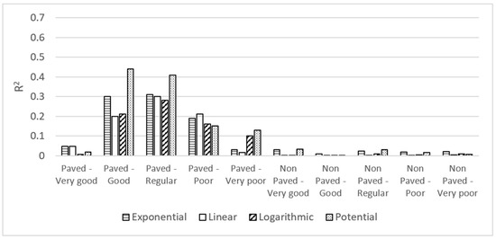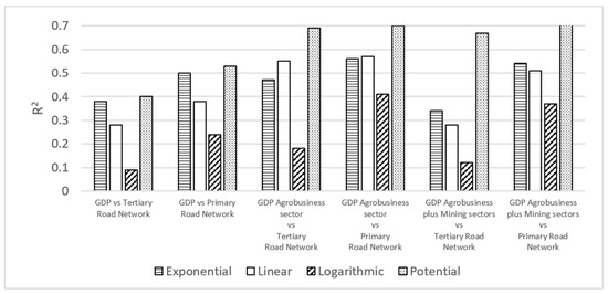 Given that the correlation between the agribusiness and mining GDP was not statistically valid, we decided to analyze only the agribusiness GDP, given that these are the activities with the greatest participation in the Colombian rural economy. Upon conducting these correlations, the greatest R2 value for the linear, exponential, potential, and logarithmic regressions was 0.44 for the condition Good, and potential regression (Figure 4). For the correlation between agribusiness GDP and the non-paved roadway network, the resulting R2 values for the linear, exponential, potential, and logarithmic regressions do not exceed the value of 0.03 (Figure 4).