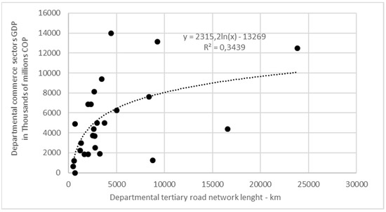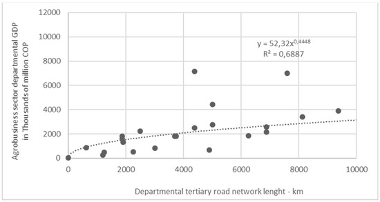 The GDP of the departmental agribusiness sector was correlated with the tertiary network, with the following results for the R2 values: 0.47 for exponential regression, 0.55 for linear, 0.18 for logarithmic, and 0.69 for potential (Figure 5). Upon adding Adding the mining GDP R2 values to those of agrobusiness agribusiness GDP, the resulting regressions were as follows: 0.34 for exponential regression, 0.28 for linear, 0.12 for logarithmic, and 0.67 for potential (Figure 5). The R2 values regarding the agribusiness sector (0.69) resulted in a greater value than when including the mining sector (0.67), which was very close to 0.7 and the reason for which the resulting regression was analyzed (Figure 6) Equation (1). Unlike what was concluded in the previous paragraph, the GDP of the agribusiness sector does present an acceptable correlation (R2 value close to 0.7) with the tertiary roadway network length in each department. Additionally, the standard error results in a value of 0.09 and a p-value of 1.41 × 10−5, confirming that there is a statistically significant correlation.