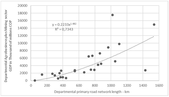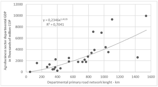 Lastly, a similar analysis to the above was carried out; however, it specified the contribution of the GDPs of greatest relevance to the economic sectors in a rural scenario: agriculture, livestock, fishing, hunting, and silviculture (presented together as the agribusiness sector), and additionally, added the GDP value of mining (Table A8). Additionally, other correlations were carried out between the agribusiness with mining GDP and the length of the primary- and tertiary-level roadway networks (INVIAS, 2020) [28], for each department (Table A9).