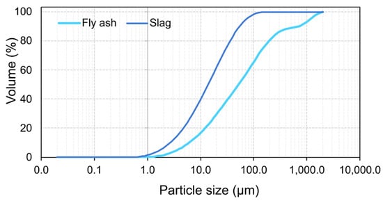 The precursors used in the present study are class F fly ash procured from NTPC, Ramagundam, India and slag obtained from JSW limited, India, respectively. The procured fly ash and slag conform to the specifications of ASTM C618-19 [] and ASTM C989/C989M-18a [], respectively. The particle size distribution of the precursors is presented in Figure 1. Table 1 shows the oxide composition and other physical properties of the precursors.