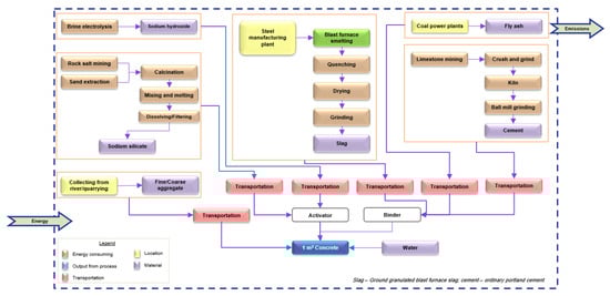 The system boundary, as presented in Figure 3, was used in the present study. The cradle-to-gate approach of LCA was adopted, including calculations of all the emissions and energy consumption from the raw material procurement to the preparation of concrete. Since the primary objective of this study was to compare different AAC mixes, the usage and disposal phases were not considered, and it was assumed that the environmental impact from these phases would be equivalent.