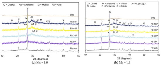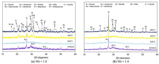The X-ray diffraction analysis was performed to evaluate the effect of varying precursor proportions on different phases of reaction products in AAB and analyze the variations in microstructure on exposure to high temperatures. Figure 4a,b presents the XRD pattern of AAB with Ms = 1.0 and 1.4 exposed to ambient temperature.