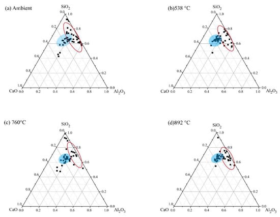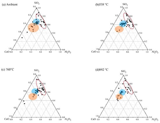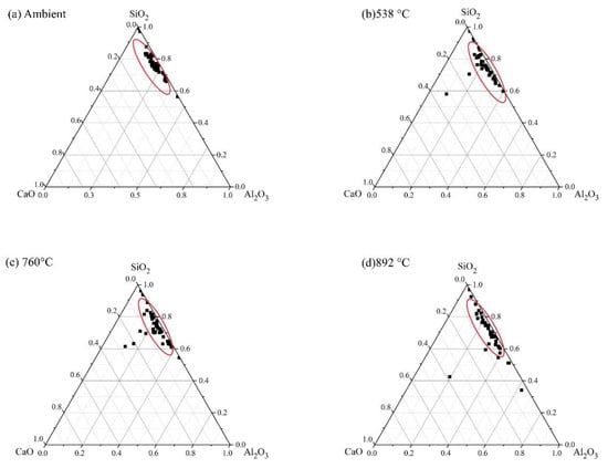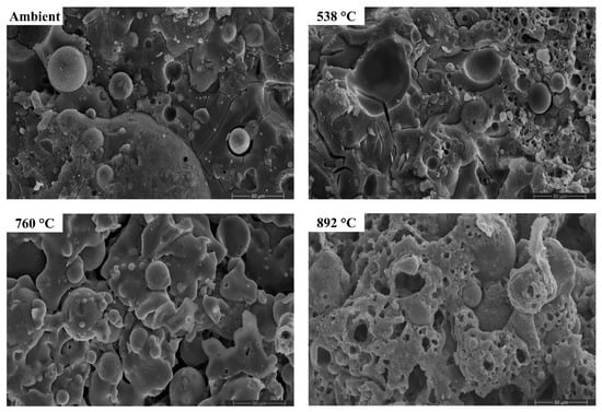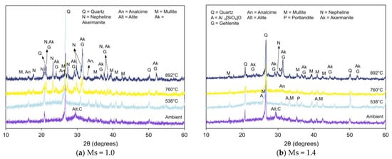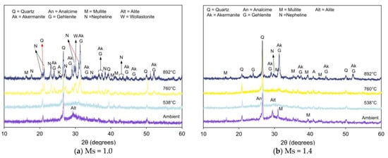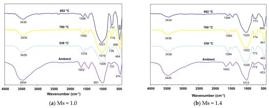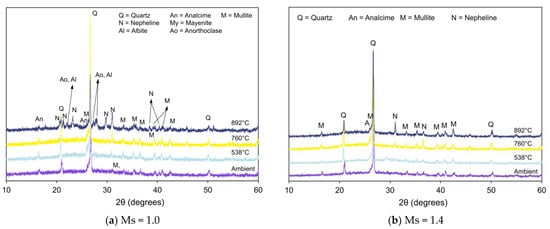 Figure 5a,b present XRD patterns of FS 0P-1.0 and FS 0P-1.4, respectively, before and after exposure to elevated temperatures. No noticeable difference was observed in the XRD pattern of AAB (FS 0P-1.0 and FS 0P-1.4) at the ambient temperature and after exposure to 538 °C. A considerable number of new peaks were formed on exposure to higher temperatures of 760 °C and 892 °C. Geopolymeric phases tend to dehydrate at such high temperatures and recrystallize to form nepheline (Na3KAl4Si4O16), albite or other stable aluminosilicates []. These transformations include intermediate sintering and subsequent development of the vitreous phase []. With the increase in temperature beyond 760 °C, the formation of nepheline at 2θ = 20.5°, 23.1°, 27.2°, 28.1°, 29.8°, 31.1°, 38.5°, and 41° can be observed from Figure 4b. At higher temperatures (892 °C), the presence of albite was also detected in AAB with Ms = 1.0. Albite (Al/Si = 0.3) is a less Al-rich phase than nepheline (Al/Si = 1) []. A previous study reported that both nepheline and albite were formed when Na+ content is sufficient []. The findings from the present study corroborate with the reported research since AAB with Ms = 1.0 has higher Na+ content than AAB with Ms = 1.4.