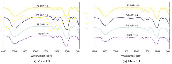 Figure 9a,b show the FTIR spectra for matured AAB samples with Ms 1.0 and 1.4, respectively, after exposure to ambient conditions. The evident disparity in the spectra of FS 0P and the other blended AAC mixes indicated the different reaction products formed on the alkali-activation of only fly ash and fly ash-slag blends. The primary reaction products formed in AAB are essentially made up of AlO4 and SiO4 tetrahedra. At ambient temperature, the major bands in the range of 3600–3200 cm−1 correspond to symmetric stretching of the O-H group of water in the system. The bands in the range of 1639–1647 cm−1 were assigned to symmetrical bending of the H-O-H bond of water. Stretching of the O-C-O band at 1411 cm−1 ascribed to the occurrence of carbonation reaction. Enhanced carbonation resistance of AAB with a greater proportion of slag ascertains its pore refinement [].