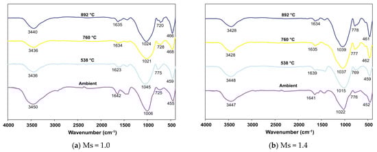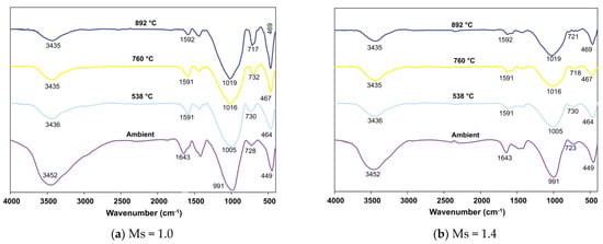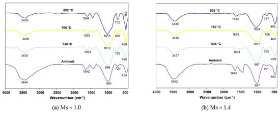 Figure 10a,b show the variation in the FTIR spectra of FS 0P-1.4 and FS 0P-1.0, respectively, as a function of exposed temperature.