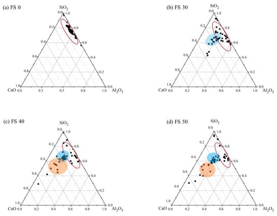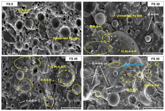 The bands in the vicinity of 1000 cm−1 are assigned to the stretching of Si-O associated with SiO4 tetrahedra present in the glassy phase []. The chemical shift in the position of these bands with respect to FS 0P is attributed to the greater amount of Ca and the formation of C-A-S-H []. A previous study by Garcia-Lodeiro et al. (2011) [] reports that the bands at 952 cm−1 and 960 cm−1 are characteristic of C-A-S-H and C-S-H matrices, respectively. In the present study, it is evident that with increasing slag content, the bands ascribed to N-A-S-H shifted to lower wavelengths closer to the characteristic bands of C-A-S-H and C-S-H, evincing that the formed reaction product is a combination of N-A-S-H and C-A-S-H. The band located at 777 cm−1 is assigned to Si-O stretching of quartz and indicates the presence of unreacted fly ash. The band in the range of 460 cm−1 corresponds to the in-plane bending of Si-O-Si linkage associated with quartz. Similar bands were observed in unreacted fly ash, and these results substantiate the XRD analysis, which showed the presence of quartz and mullite observed in fly ash before and after alkaline activation.