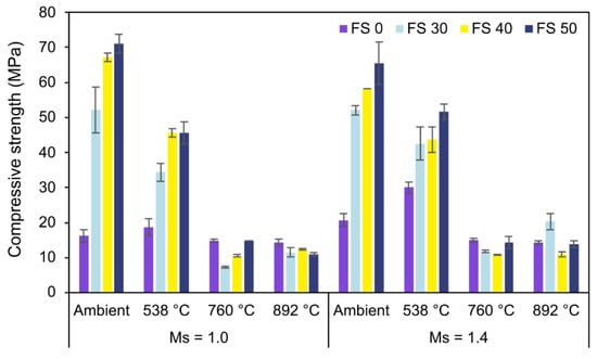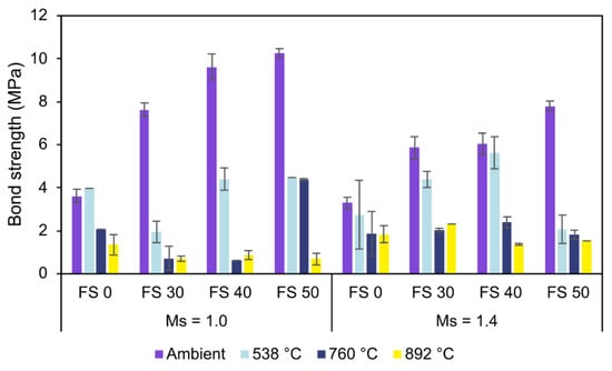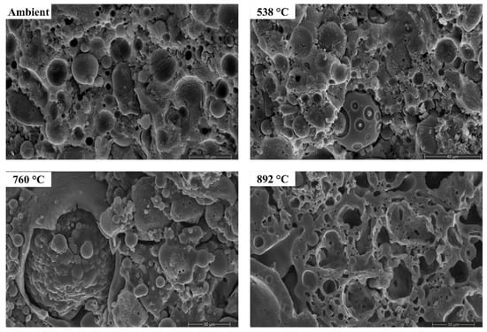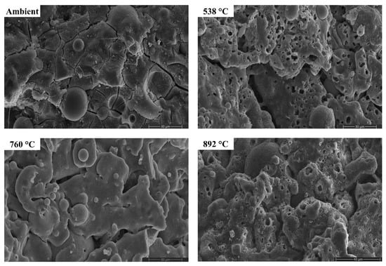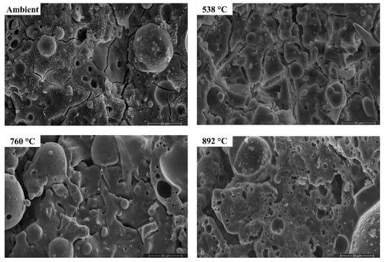 The presence of akermanite and gehlenite cannot be differentiated from XRD analysis, as both are isomorphs with close diffraction plane spacing []. It should be emphasized here that the peaks corresponding to akermanite and gehlenite increase with slag content. Peaks ascribed to calcite were observed in FS 30P and FS 40P under ambient exposure conditions and were absent in the diffractograms of these samples after exposure to temperatures of 760 °C and 892 °C. This behavior is attributed to the decomposition of calcite at temperatures of 550 °C. In the present study, reflections of wollastonite were observed in XRD patterns of FS 40P and FS 50P exposed to temperatures above 760 °C. The formation of this phase is attributed to the decomposition of C-A-S-H or devitrification of slag [].