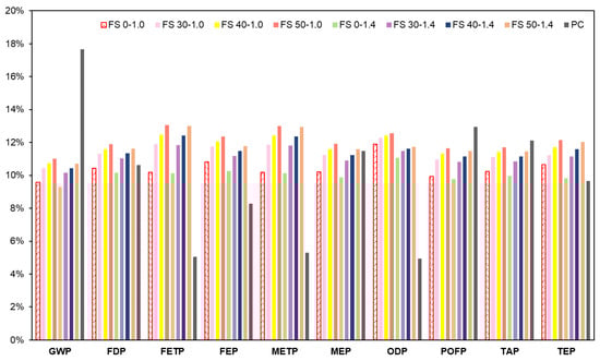 Life cycle impact assessment (LCIA) was performed using the ReCiPe 2016 midpoint and endpoint methodology []. The hierarchist perspective was adopted in this study because it is based on a scientific agreement concerning both the time period (100 years) and the credibility of impact factors []. However, to verify the robustness of ReCiPe, other methods based on the ILCD handbook [] recommendations were also used. Hence, this study compares different impact categories evaluated using default LCIA methods and the selected ReCiPe midpoint (H) v1.13. The impact categories analyzed in this study through the ReCiPe method were GWP, fossil depletion potential (FDP), freshwater ecotoxicity (FETP), freshwater eutrophication (FEP), human toxicity potential (HTP), marine ecotoxicity potential (METP), marine eutrophication potential (MEP), ozone depletion potential (ODP), photochemical oxidant formation potential (POFP), terrestrial acidification potential (TAP), and terrestrial ecotoxicity potential (TEP). The other methods selected based on the recommendations of ILCD handbook for: