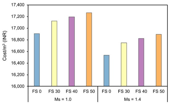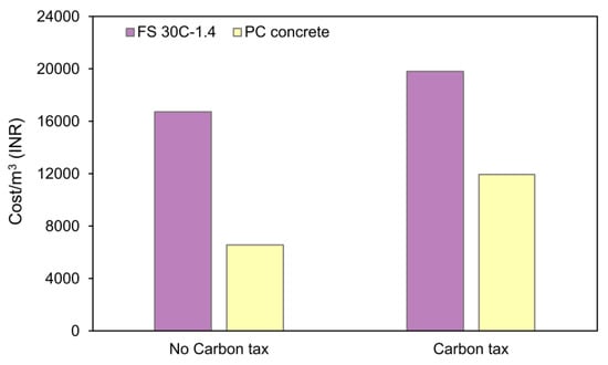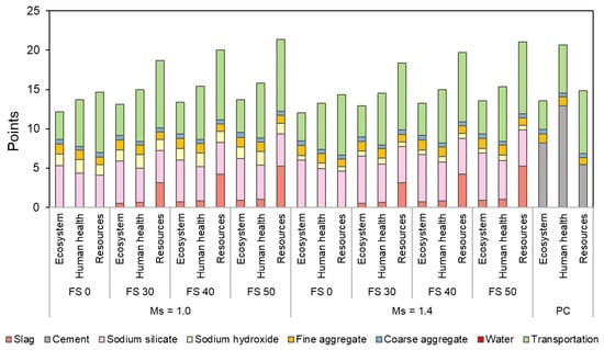 The primary aim of this study was to investigate and compare the environmental impact of AAC with varying precursor proportions and Ms. The results were analyzed to evaluate the proposed optimum mix in improving the environmental sustainability of AAC. Cost analysis was performed to assess the economic viability of the mixes in the Indian scenario. Environmental impacts were assessed for a functional unit of 1 m3 of concrete. Nine concrete mixes were assessed for their environmental impact in this study: (i) FS 0C-1.0; (ii) FS 30C-1.0; (iii) FS 40C-1.0; (iv) FS 50C-1.0; (v) FS 0C-1.4; (vi) FS 30C-1.0; (vii) FS 40C-1.4; (viii) FS 50C-1.0; and (ix) PC concrete of strength equivalent to FS 30C.