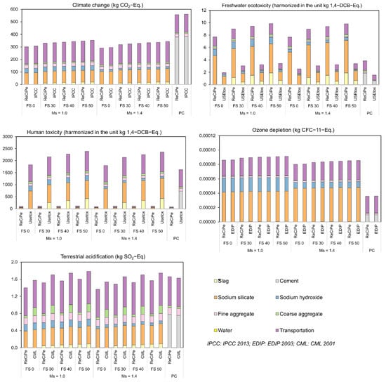 One of the primary reasons for the shift towards alternative binders is environmental sustainability. It is reported that about 80% of the energy consumption and greenhouse gas (GHG) emissions from the building sector are caused during the operation phase [,]. However, the remaining 20% of the environmental burden is generated during raw material manufacturing, which can be efficiently reduced by using alternative binders that do not consume additional production energy []. Life cycle assessment (LCA) is an efficient technique to evaluate the environmental impact of a product throughout its life cycle. Only few extensive studies have reported the detailed environmental impact of using blended alkali-activated binders as opposed to PC in the construction industry to date.