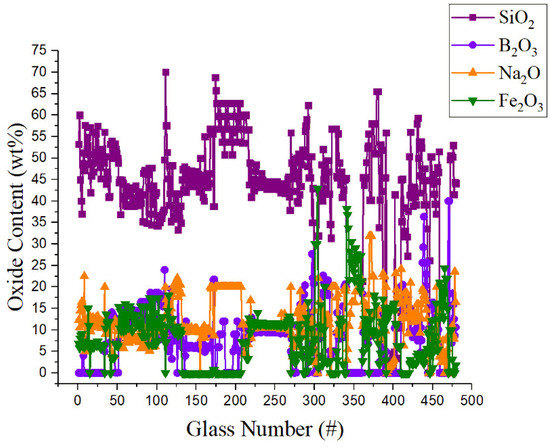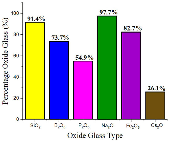 Figure 2 shows the percentage of oxide glass formers and modifiers considering any percentage content (i.e., from dopant level up to the maximum concentration). Sodium, silicon, iron, and boron oxides prevail in most radioactive-waste glasses analyzed in this work.
