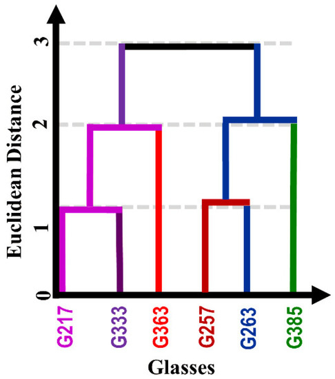 As presented in a schematic plot (Figure 3), glasses G217 and G333 were the most similar, followed by G363 forming a small cluster. In the same way, glasses G257 and G263 were the most similar, followed by G385 in terms of composition.