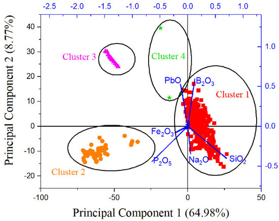 Biplot of principal component 1 (related mainly to SiO2, P2O5, Fe2O3, B2O3, and PbO contents) versus principal component 2 (related mainly to PbO, B2O3, Na2O, SiO2, and P2O5) considering all waste glass compositions and the covariance matrix. Borosilicate glasses are predominant and located at the center. It is possible to map all glasses in four clusters related to hierarchical and non-hierarchical results. All other variables were discarded from this biplot for a better view of the main oxides.