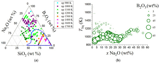 (a) Ternary diagram of selected sodium borosilicate glasses from SciglassTM database (version 7.9). The blue region corresponds to approximately the Tliq behavior from a plethora of sodium borosilicate waste-immobilization glasses. (b) The liquidus temperature (Tliq, in K) dependence on sodium oxide content. In this graph, it is possible to observe that the liquidus temperature decreases when sodium oxide increases up to near 30%, and boron oxide has also an important role.