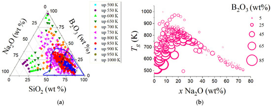 (a) Ternary diagram of selected sodium borosilicate glasses from SciglassTM database (version 7.9). The blue region corresponds to approximately the Tg behavior from a plethora of sodium borosilicate waste-immobilization glasses. (b) The Tg dependence on sodium oxide content. Most NBS-based waste-immobilization glasses present a Tg around 800 K with 20 wt% of Na2O, and Tg varies strongly with sodium and boron oxides. For a fixed sodium oxide content up to 25 wt%, Tg increases when boron oxide decreases.