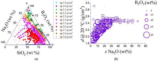 (a) Ternary diagram of selected sodium borosilicate glasses from SciglassTM database (version 7.9). The blue region corresponds to approximately the density behavior from a plethora of sodium borosilicate waste-immobilization glasses. (b) The density dependence on sodium oxide content at 20 °C. Density shows a high increase, from 1.8 to 2.5, changing the sodium oxide content up to 30 wt%, and maintaining this fixed value for higher sodium concentrations.