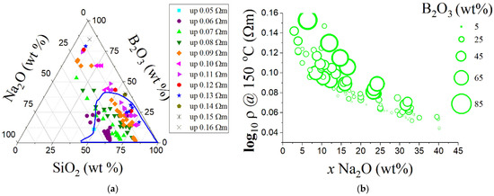 (a) Ternary diagram of selected sodium borosilicate glasses from SciglassTM database (version 7.9). The blue region corresponds to approximately the logarithm of resistivity behavior at 150 °C from a plethora of sodium borosilicate waste-immobilization glasses. (b) The resistivity dependence on sodium oxide content at 150 °C. Resistivity decreases with the increasing sodium oxide content, and for a fixed sodium oxide content, resistivity in general also decreases with the decreasing boron oxide content.