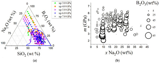 Figure 9a shows the microhardness m of 258 NBS glasses. The value depends strongly on the amount of sodium and boron contents. Figure 9b shows that, in general, m increases with the decreasing B2O3 content for a fixed sodium content. Na2O content significantly impacts glass behavior under a sharp indenter, as Barlet et al. [114] documented. They produced NBS glasses with sodium content between 12.2 and 35.4 mol% and measured their mechanical properties. A material’s hardness refers to its stiffness or resistance to bending, scratching, abrasion, or cutting. The hardness of glass can be both beneficial and harmful.